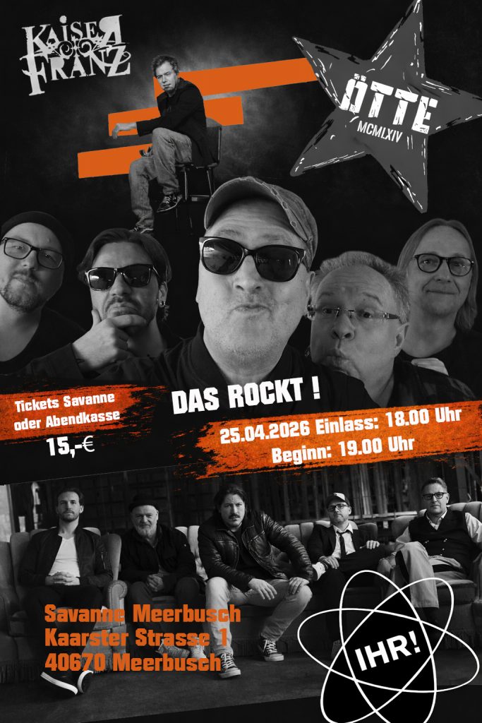 Gäste sind die wunderbaren Jungs von Ihr mit ihrem Leadsänger Mars Saibert, die ordentlich Gas geben werden, um Ihren Ruf als reinrassige Rockband gerecht zu werden. Und mit KAISER FRANZ wird das ganze schön rund gemacht.